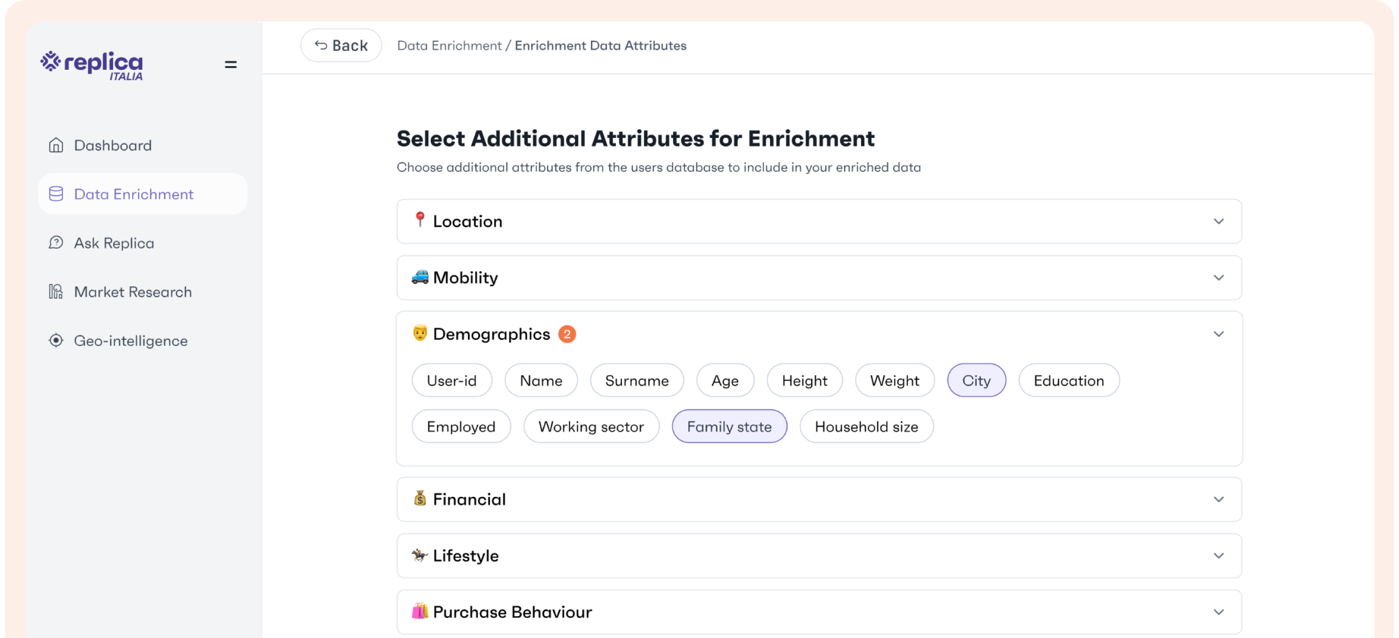 Entra nella piattaforma e inizia a esplorare i dati sintetici sui consumatori italiani. Consumer insights, arricchimento CRM e geo-intelligence a portata di click.